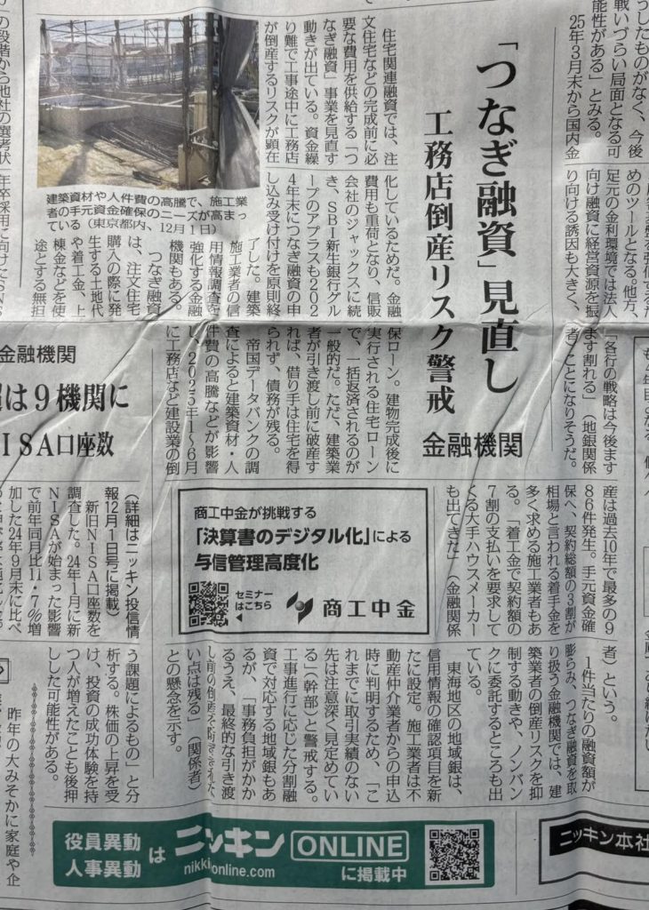 建設倒産多発により、建設下請け工事会社の命綱「つなぎ融資」が無くなってゆく。